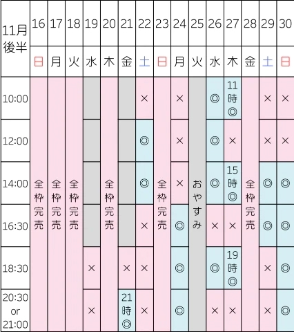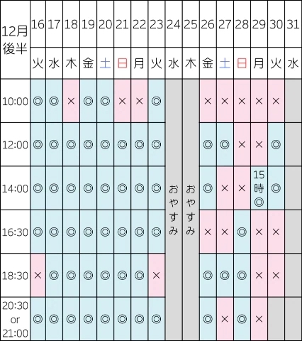 ・ご希望日時(10:00/12:00/14:00/16:30/18:30/20:30 or 21:00)