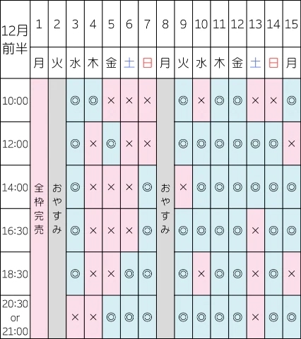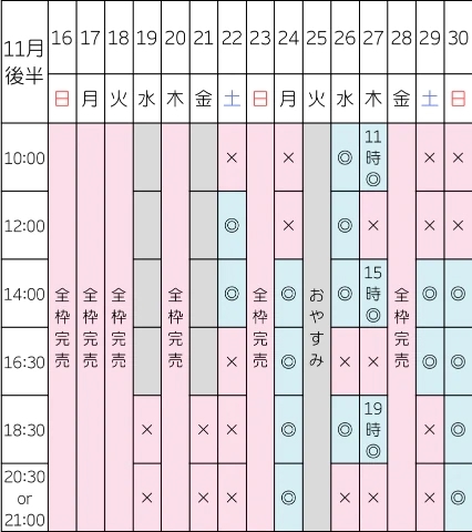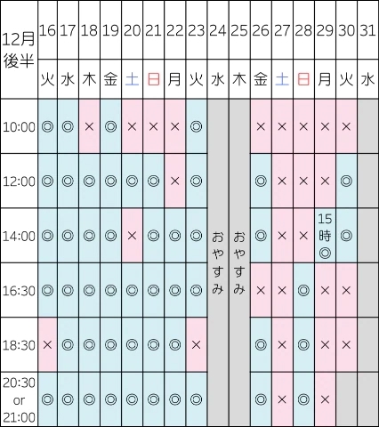 ・ご希望日時(10:00/12:00/14:00/16:30/18:30/20:30 or 21:00)