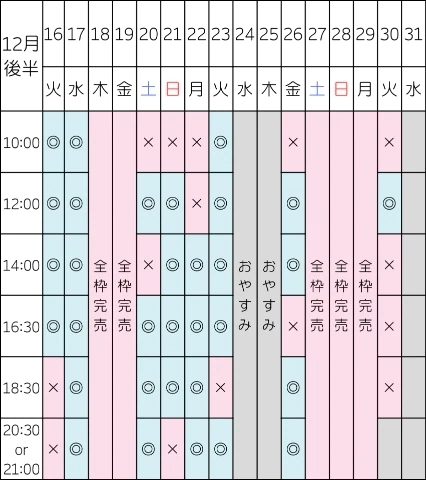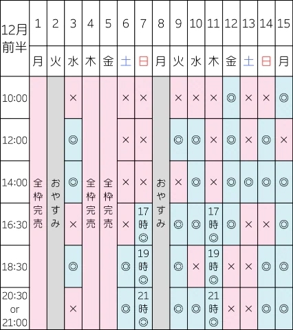 ・ご希望日時(10:00/12:00/14:00/16:30/18:30/20:30 or 21:00)