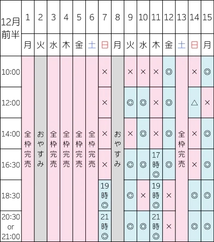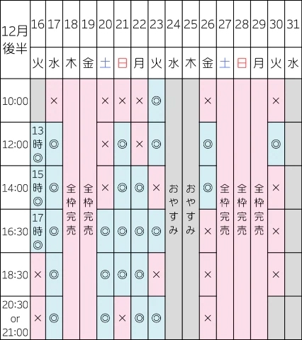 ・ご希望日時(10:00/12:00/14:00/16:30/18:30/20:30 or 21:00)