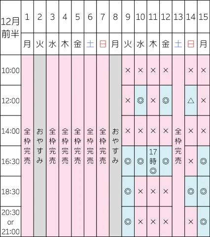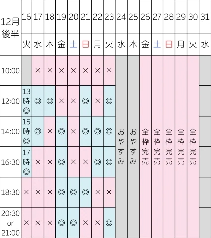 ・ご希望日時(10:00/12:00/14:00/16:30/18:30/20:30 or 21:00)