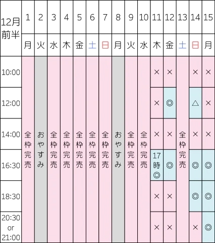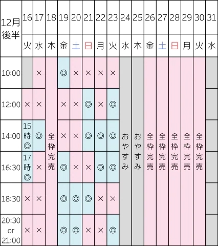 ・ご希望日時(10:00/12:00/14:00/16:30/18:30/20:30 or 21:00)