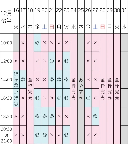 ・ご希望日時(10:00/12:00/14:00/16:30/18:30/20:30 or 21:00)