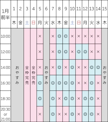 土日祝は特に早い時間帯(10:00/12:00/14:00)が