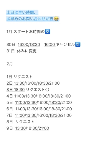16:00キャンセルになったので16:00/18:30があいてるにょん❕