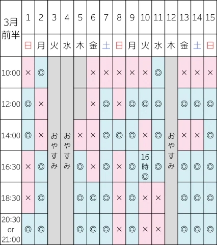 土日祝は特に早い時間帯(10:00/12:00/14:00)が