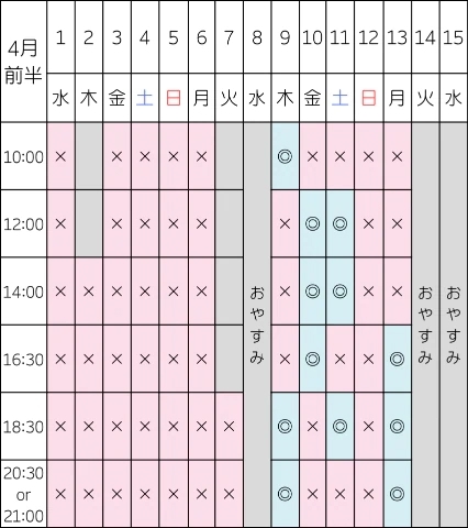 土日祝は特に早い時間帯(10:00/12:00/14:00)が