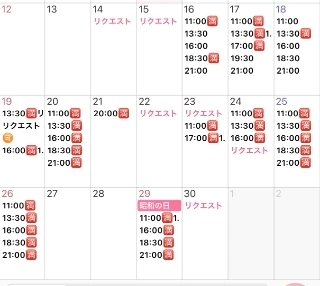 今月の🈳は残り16.17.18のみですが、ご新規様と本指名様のどちらも、リクエストと記載の日は好きな時間をご連絡くださればご予約できます✉️💓