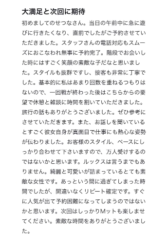本日出勤 ひすい22 164 84(C) 54 85 12:00-21:30 品格ある佇まいと、しなやかに伸びる美しい肢体を併せ持つひすいさん。初対面では「余裕を纏った大人の女性」という印象。しかし、ふと視線が重なった瞬間に感じる艶やかな気配に、思わず心を奪われてしまうこ...